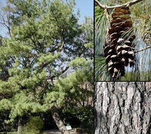 Descripción: Tronco cónico, recto y sin bambas. Posee ramas en verticilos, las cuales empiezan a formarse desde la base. La corteza en árboles jóvenes y ramitas es delgada y escamosa, de color café rojizo. En árboles maduros es fisurada gruesa y de color café oscuro grisácea. Hojas en grupos de 3 y a veces 4, raramente 5 en algunos fascículos; de unos 15-30 cms. de longitud aciculares, delgadas, cortantes, verticalmente caídas, de color verde brillante, con bordes finamente aserrados. Flores en amentos que forman conos largamente cónicos, de 7 - 9 cm hasta 12 cms, sésiles, algo encorvados, oblicuos y puntiagudos y por lo general agrupados de 3 - 6.